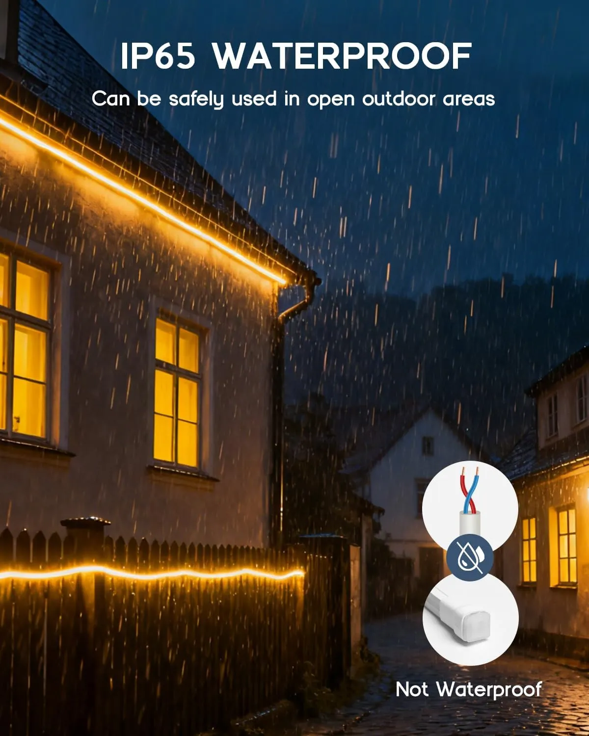 - IP65 Waterproof: The LED strip lights are housed in high-quality silicone tubing, achieving an IP65 waterproof rating suitable for both indoor and outdoor use. The flame-retardant material ensures complete safety, as it will not self-ignite even when exposed to fire.
